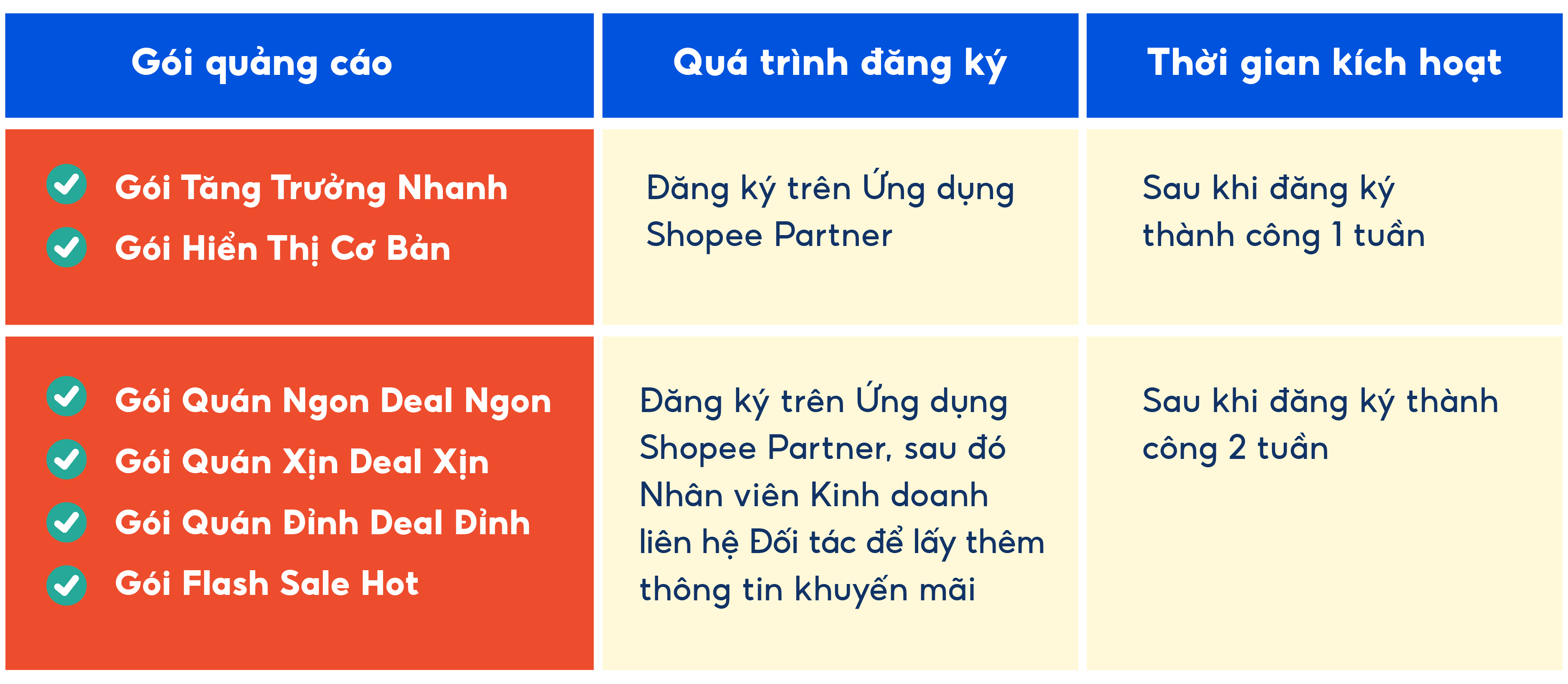 - Trường hợp không thể liên hệ được với Đối tác, việc kích hoạt gói quảng cáo sẽ được tạm hoãn tối đa 4 tuần. Trong thời gian này, Đối tác có thể chủ động nhắn tin cho Fanpage Cộng Đồng Đối Tác ShopeeFood để được hỗ trợ nhanh chóng nhất.