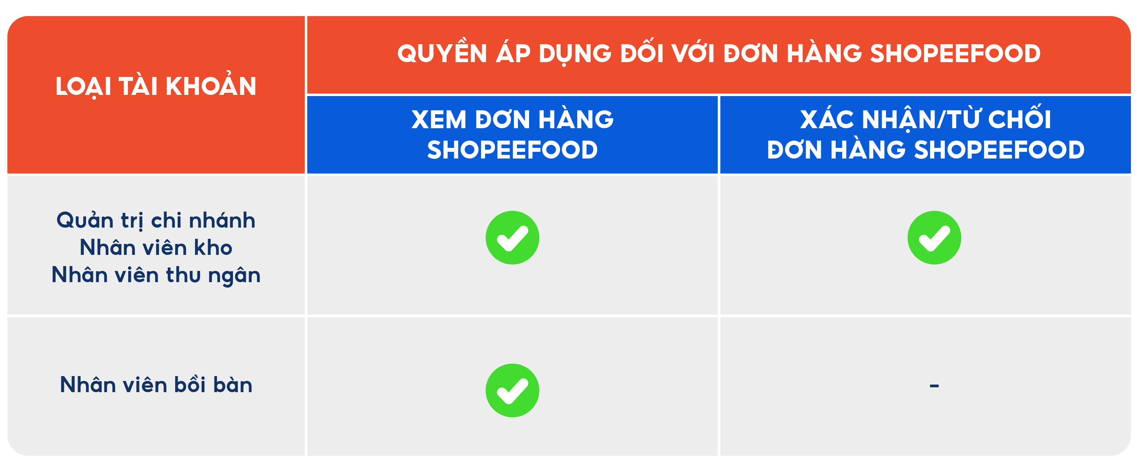 Đơn hàng ShopeeFood chỉ hỗ trợ trên Ứng dụng KiotViet Nhân viên Nhà hàng Quán sẽ có quyền truy cập khác nhau đối với đơn hàng ShopeeFood tùy theo loại tài khoản: