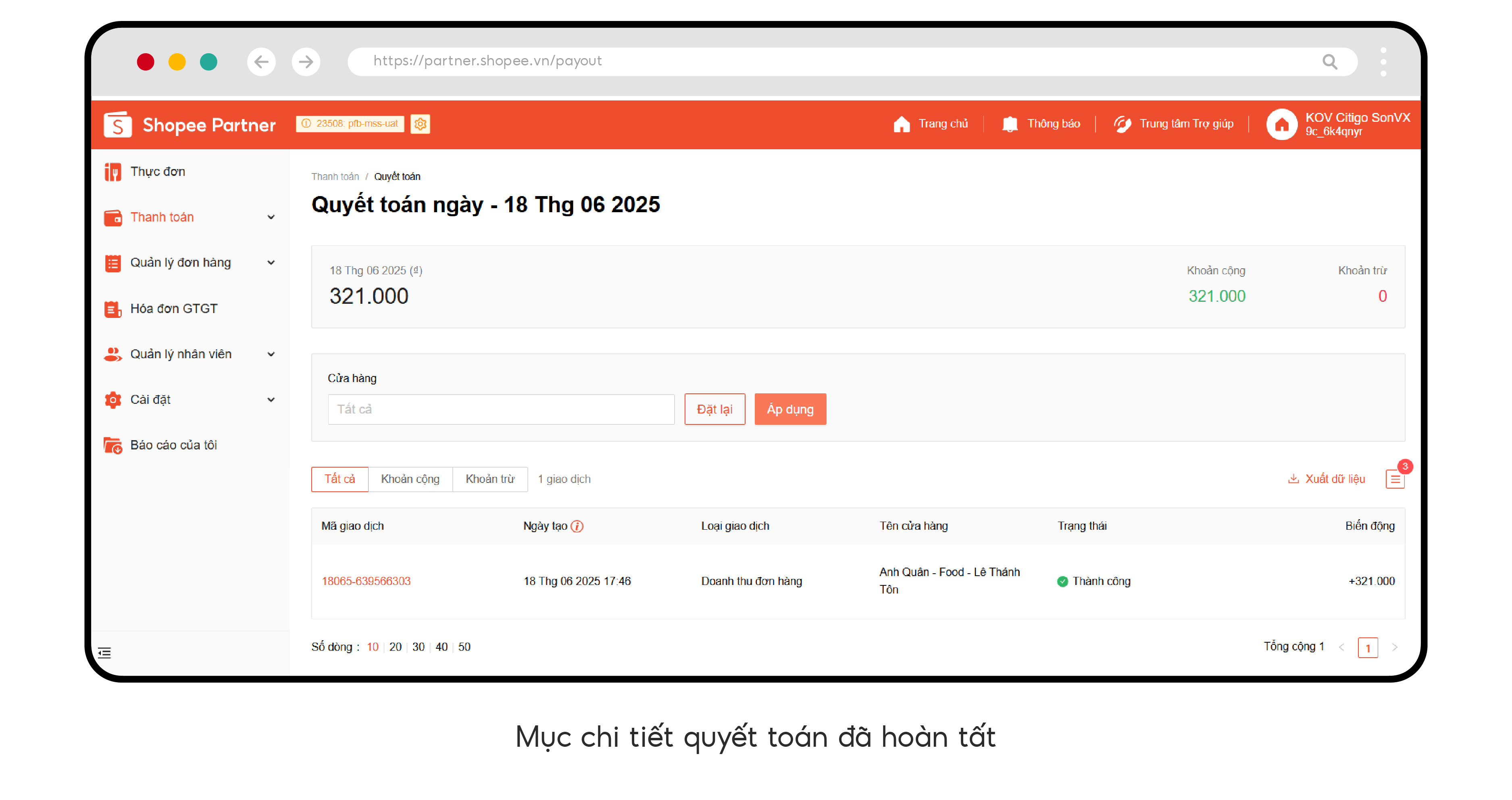 2. Trang Quyết toán từ ShopeeFood