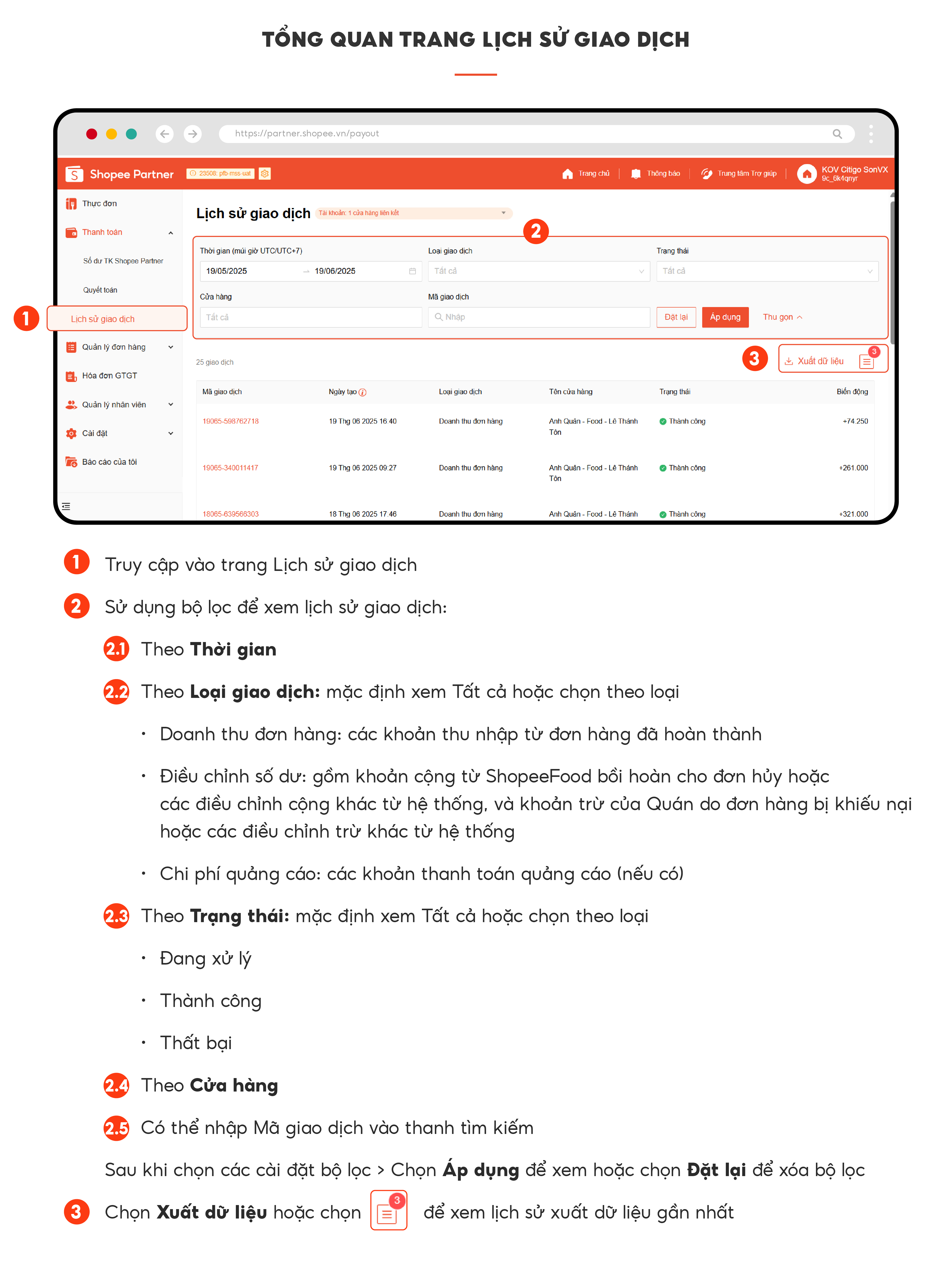 Trang Lịch sử giao dịch hiển thị dòng tiền ra/vào TK Shopee Partner, Quán sử dụng bộ lọc để phân loại các giao dịch cần theo dõi.